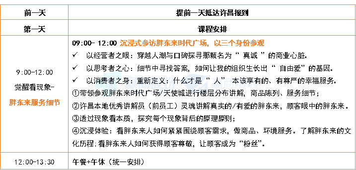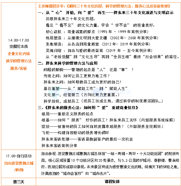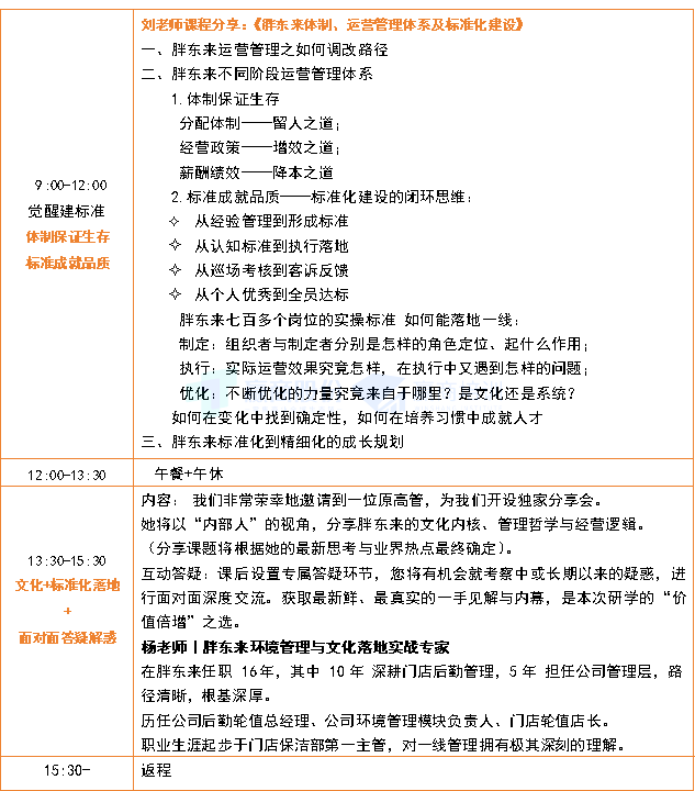 鉴于大家对胖东来的学习热情,我院特邀原标杆企业王老师&标杆企业人事体系负责人刘老师带来《走进百亿零售神话——胖东来文化内核、体制、标准化建设、服务、科学的管理方法全面解读》课程 ,学习胖东来如何将文化、体制、标准环环相扣,实现组织的统一与高效执行;剖析其标准化从建立到优化升级的全过程,掌握持续改进的方法论;独家解密胖东来服务的落地系统与巨大收益;学习胖东来是如何组织并激发上下统一、贯彻执行的。学习胖东来、成为像胖东来追求自由、平等和博爱的企业、像胖东来一样充满了真诚、美好的文明状态,让我们一起学习、研究、探索。